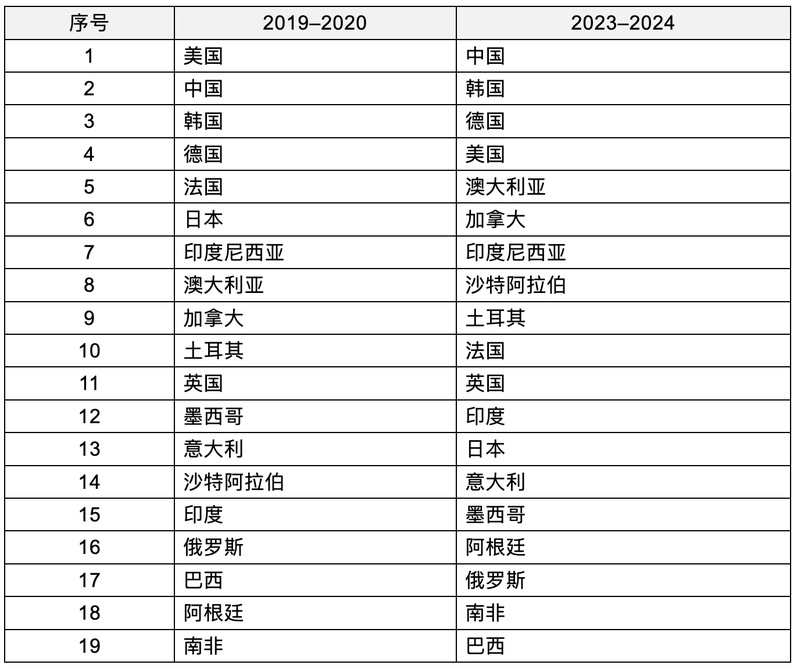 In the 2023–2024 edition, the ranking shifted to the following order: China, South Korea, Germany, the United States, Australia, Canada, Indonesia, Saudi Arabia, Turkey, France, the United Kingdom, India, Japan, Italy, Mexico, Argentina, Russia, South Africa, and Brazil,with China ascending to the first place.
