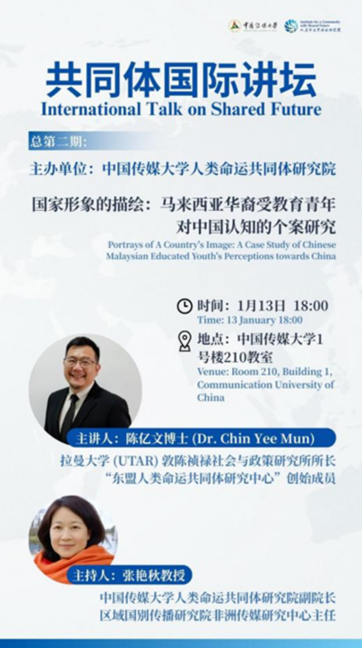 1月13日,中国传媒大学人类命运共同体研究院“共同体国际讲坛”举办第二讲。本次邀请拉曼大学(UTAR)敦陈祯禄社会与政策研究所所长、东盟人类命运共同体研究中心创始成员陈亿文博士(Dr. Chin Yee Mun)主讲,主题为“国家形象的描绘:马来西亚华裔受教育青年对中国认知的个案研究”,进一步深化东南亚与中国相关议题的探讨。人类命运共同体研究院副院长张艳秋主持了讲坛活动。马来语专业负责人张静灵等教师及相关专业学生参与聆听,讲座全程以英文进行,阿尔及利亚等国的国际学生到场交流。