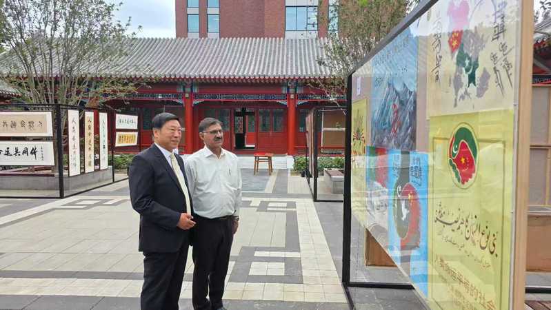 Prof. Dr. Muhammad Saleem Mazhar (second from the left), Director General of the National Language Promotion Department (NLPD), Ministry of National Heritage and Culture Division, Government of Pakistan, and Mr. Khalid Taimur Akram (first from the left), Executive Director of the Pakistan Research Center for a Community with Shared Future (PRCCSF), participate in the exhibition.